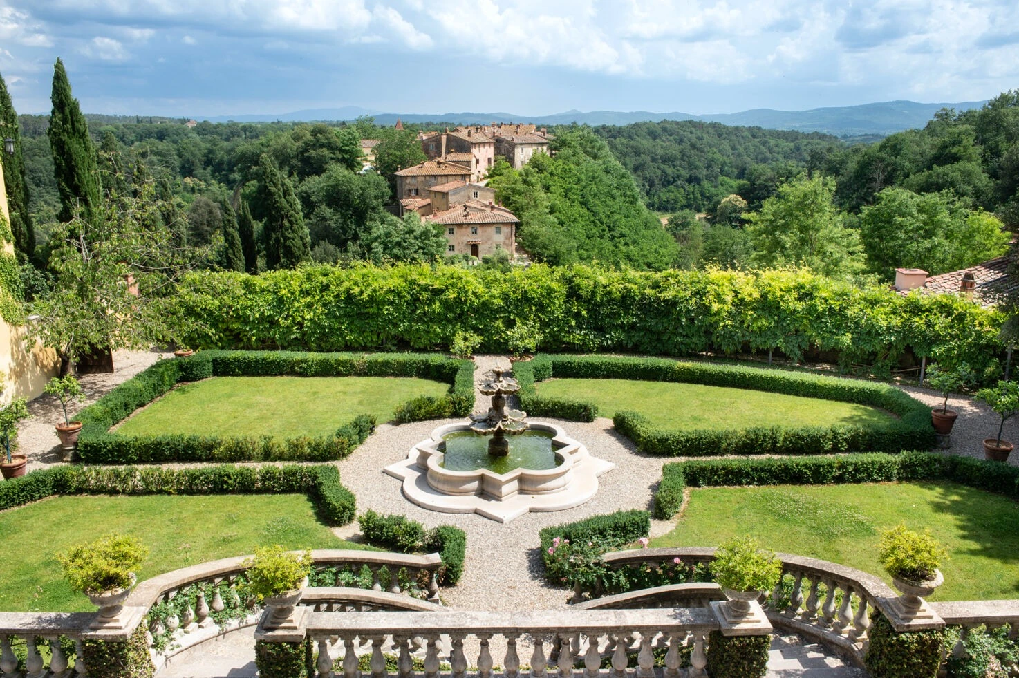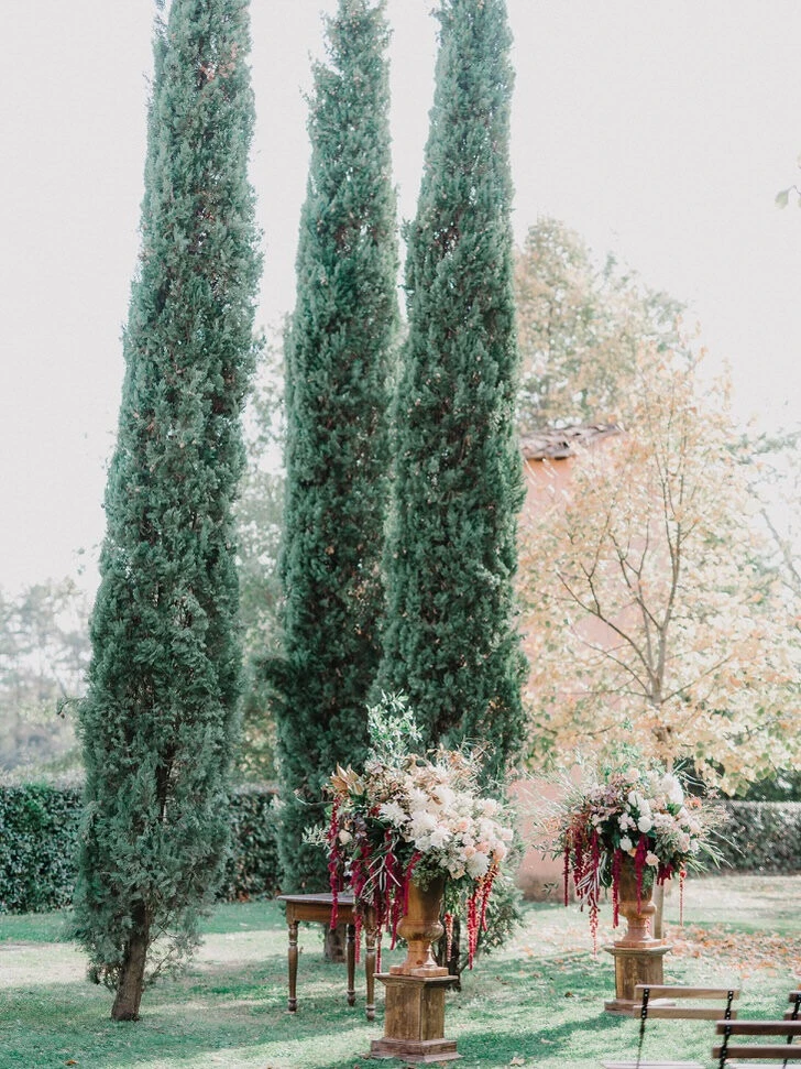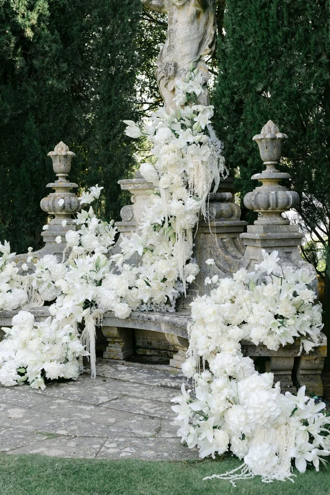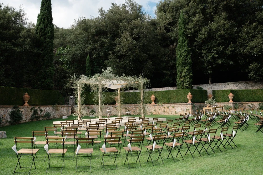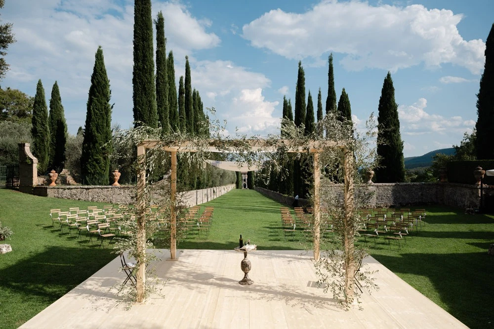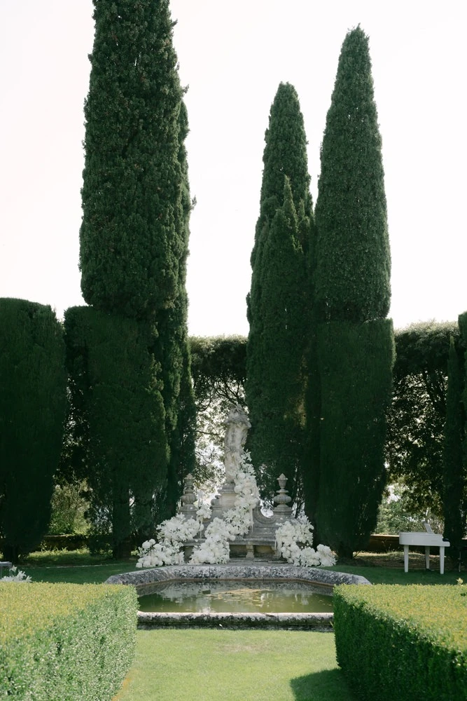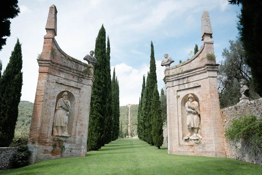 Villa Cetinale, near Siena, is a masterpiece of Italian Baroque architecture set within formal gardens designed for grandeur and intimacy alike. The gardens are a labyrinth of cypress-lined lanes, hidden nooks, terraces, fountains, and classical statues, providing countless magical spots for symbolic ceremonies and photography.