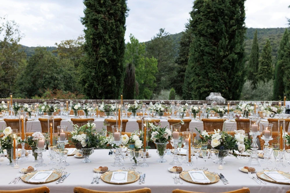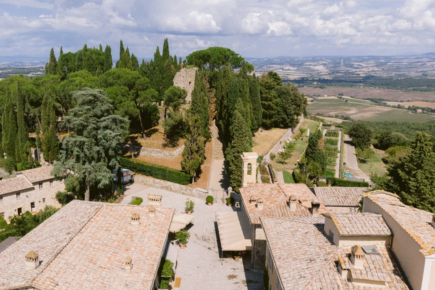 Ceremonies can take place in the meticulously maintained gardens, the historic church, or one of the elegant indoor rooms. Cocktail hours can wind through cobblestone streets, while dinner at the Ristorante Campo del Drago combines farm-to-table Tuscan cuisine with panoramic views over Val d'Orcia. Guests can stay in luxury suites or castle rooms, and enjoy a private golf course, spa, and leisure activities. The combination of history, landscape, and luxury makes Castiglion del Bosco one of Tuscany's most sought-after exclusive wedding venues in Italy, ideal for those seeking Tuscany wedding packages that blend authenticity with sophistication.