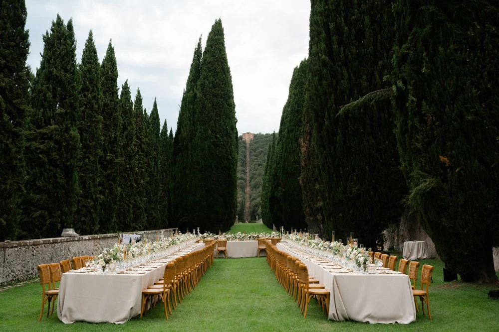 The villa itself hosts elegant receptions indoors with frescoed ceilings and marble details, while cocktail hours take place along garden terraces with sweeping views of the Tuscan hills. A grand staircase at the villa's core is perfect for dramatic entrances, cake cutting, or group photos. Guests are immersed in the villa's rich history, blending opulence and intimacy for a truly timeless wedding experience. For couples seeking wedding venues near Florence, Villa Cetinale offers the perfect blend of accessibility and enchantment.