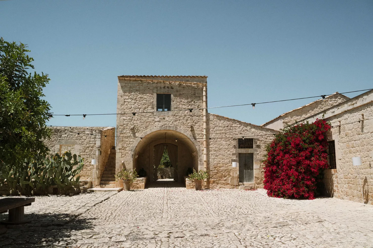 La Chiusa, a historic country house dating back to 1873, is nestled between Noto and Modica and surrounded by olive, carob, and pomegranate trees, all enclosed by high stone walls. Characterized by a country-chic style, La Chiusa offers an authentic escape from everyday life. Its expansive outdoor spaces can host up to 300 guests, while the indoor areas accommodate 80, perfectly blending rustic charm with refined elegance, making it one of the most atmospheric luxury wedding venues in Sicily.
