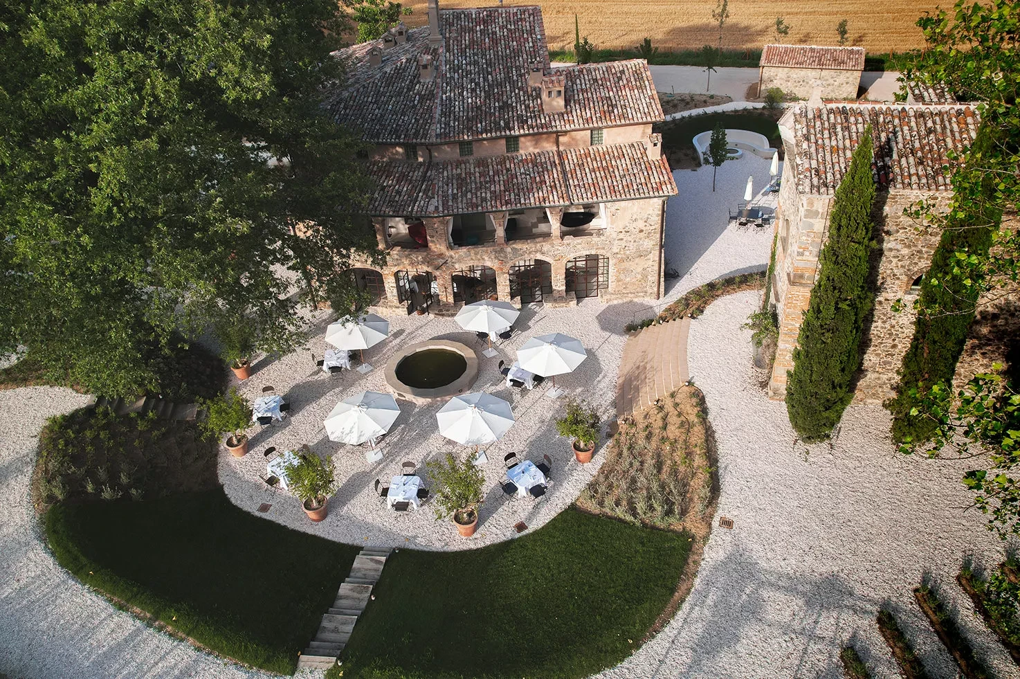 Vocabolo Moscatelli, in the heart of Umbria, is nestled in a gentle valley surrounded by ancient forests. With 12 deluxe rooms and suites, it accommodates intimate celebrations for up to 50 guests. Features include a swimming pool with solarium, lush gardens, a barbecue area for relaxed welcome dinners, and a private chapel for ceremonies, making it an ideal luxury wedding venue in Umbria.