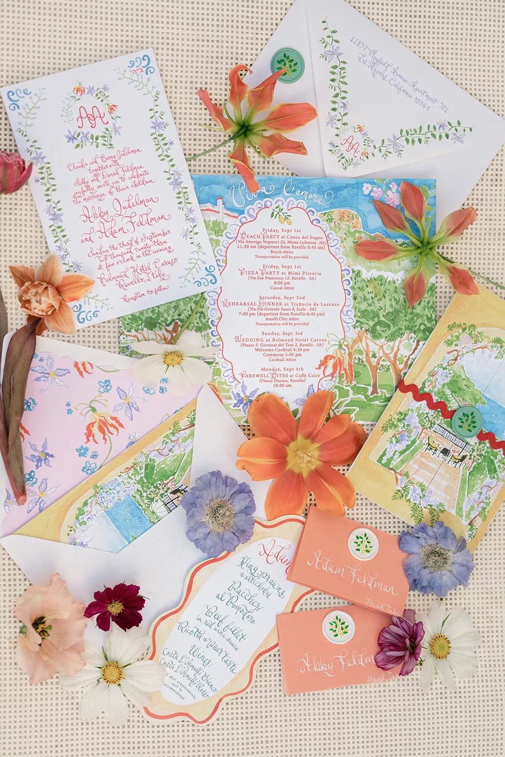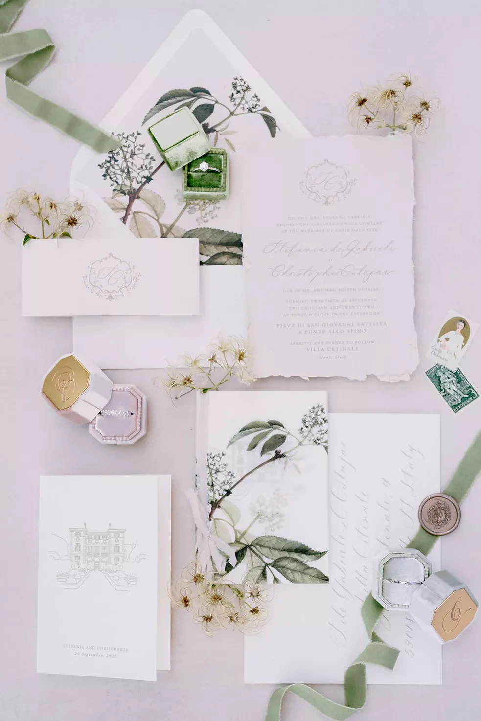 Luxury stationery is about craftsmanship and personalization — from hand-pressed invitations and calligraphy to custom signage and day-of details. Budgets start around €3,500–€6,000, with bespoke suites or artisanal designs reaching €10,000 +, especially when incorporating fine printing, wax seals, or watercolor artwork.